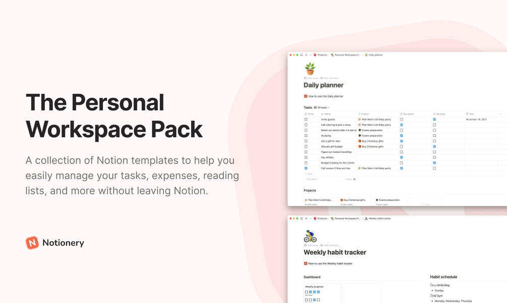 Don't get overwhelmed with your day-to-day tasks again. The Personal Workspace Pack by Notionery contains templates that you can use to de-clutter your life. No need to reinvent the wheel - use templates that already work for others and help them manage their habits, expenses, tasks, or subscriptions. Simply duplicate the pack and integrate it into your daily work or personal life, as a part of your daily Notion workflow.